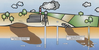 Poluição: A partir da superfície, os produtos quimicos dissolvem-se na águae infiltram-se no solo, contaminando extensas áreas.